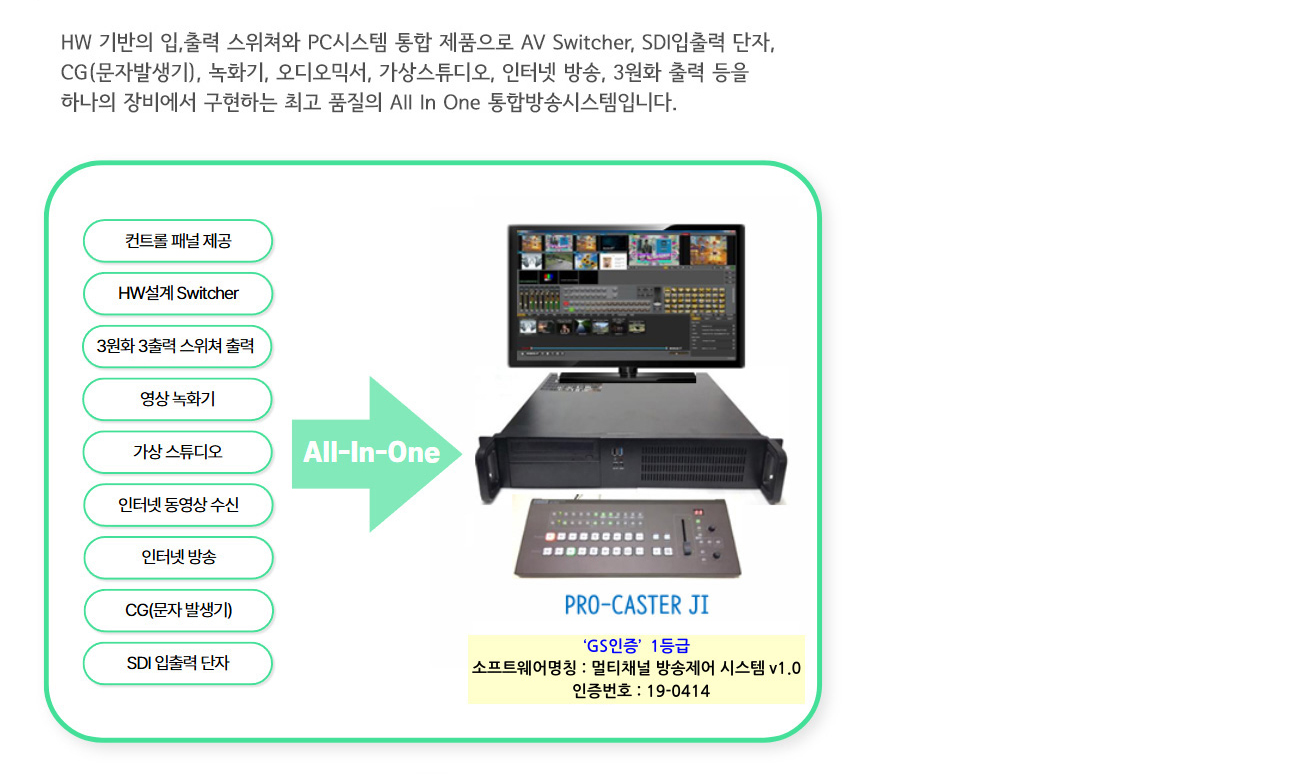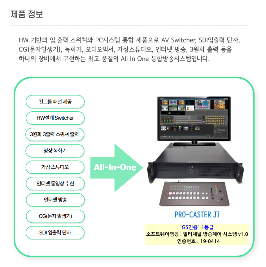 5출력의 단자와 IP수신, USB카메라(옵션)등 다양한 입력과 콘텐츠를 실시간 전환하는 스위쳐 기능, 크로마키, 자막그래픽편집, XLR단자의 외부 오디오 입출력기능 및 지연이 없는 영상출력, 녹화, 스트리밍, 외부장비 제어등이 가능한 구내방송 시스템에 최적화한 One STOP ALL in One 방송 시스템입니다.